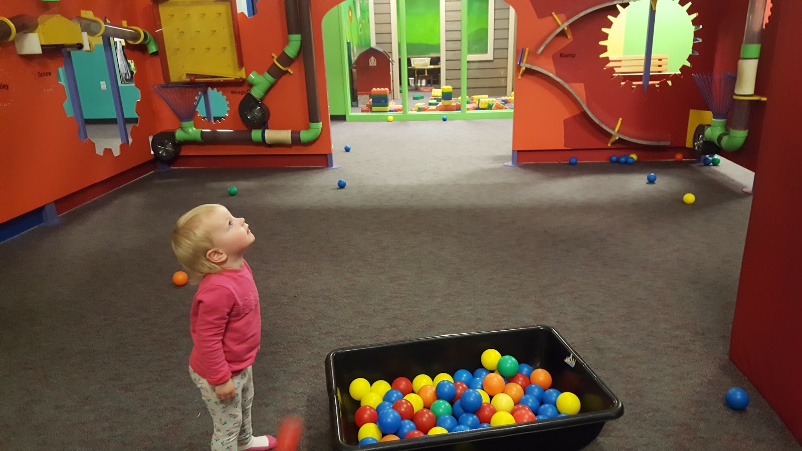 When Nell was ready to leave the water area I took the girls over to the Davinci center for some painting and exploring. Reid stayed in the water area for at least half an hour. I love that he's old enough I can let him just be for a bit. It's so much easier to only worry about one child (Coraline) running away and getting lost. Nell started whining that she was hungry, but we still found time for the ball bit and the construction trucks before going downstairs for our snack.